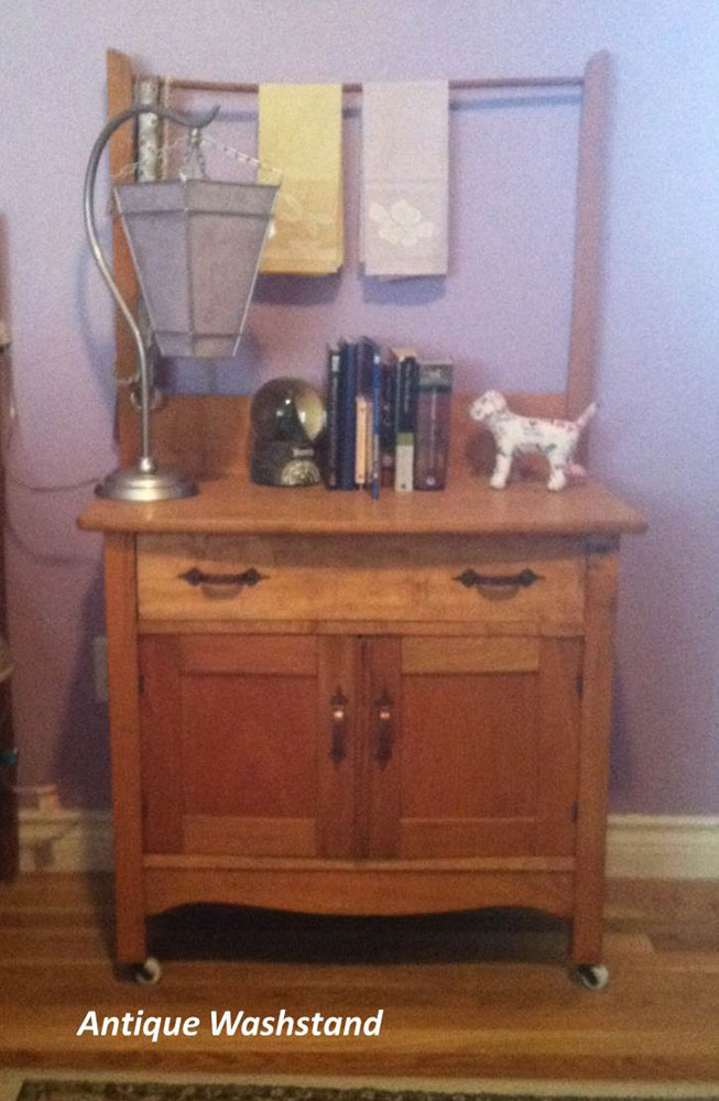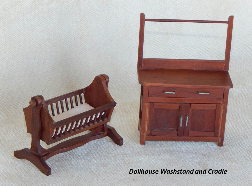 3. Make Copies for Everyone. Later on Grandpa R got interested in dollhouse furniture. He found that he could make seven pie safes (one for each of us) if they were only 6" tall. The collection grew to include: a four-poster bed, dining table and chairs, dresser, couch, side chair, cradle, grandfather clock, and washstand. The washstand was a copy of a full-sized piece that they had in the upstairs bathroom.