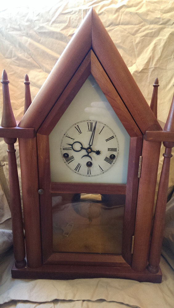 : Our family's was made out of cherry with a chiming movement and little turned spires, like a cathedral. Looking back, I wonder how he got all those odd miters so tight.