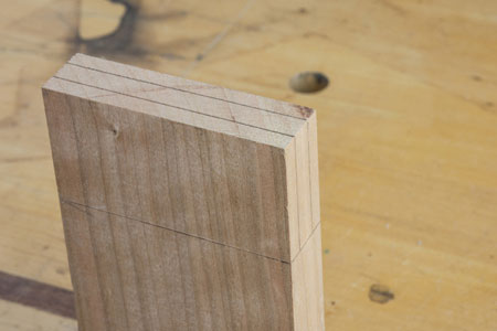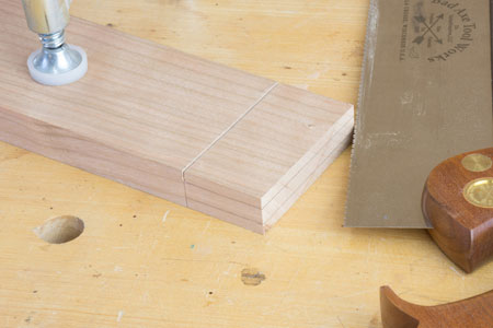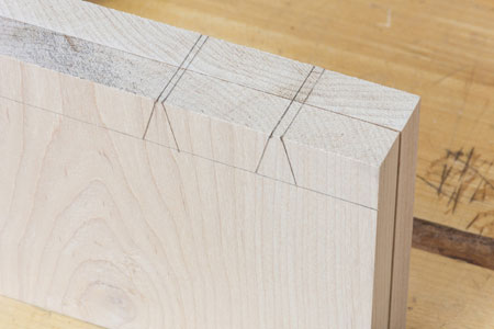 . This saw has a 2-3/8 inch depth so it can cut larger dovetails than a conventional dovetail saw like the Stiletto. The interesting thing about this saw is the 'hybrid' set that Bad Axe has developed. The hybrid set is a combination set that lets you cut both cross-grain and rip. Therefore, it works really well on tenon joinery where you can now do both cuts with the same saw. Here is a typical layout for a tenon. I've used a marking gauge to define cheeks and shoulders for the tenon.