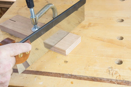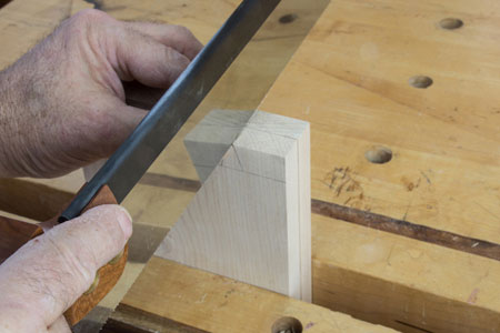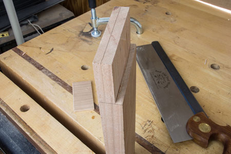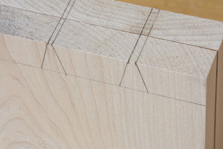 The photograph shows two boards clamped together so I can cut both tail boards at the same time. As an aside, if you look close in the following picture you can see I 'bend over' the corner of my knife line which helps to start the saw and 'split the line'.