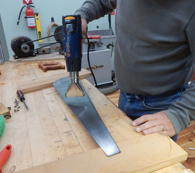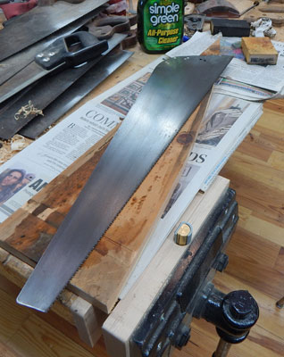 First I disassembled the saw and cleaned the sawplate. I like the Simple Green cleaner approach using flex sponges up to 320 grit. No nasty odor and less toxic mess compared to mineral spirits. The saw plate actually had very little pitting and came up to a nice shine with relatively little effort. Dealing with the bow in the sawplate was a little more involved. Since I had a bow, not a kink, I opted for the low heat option using a heat gun.
