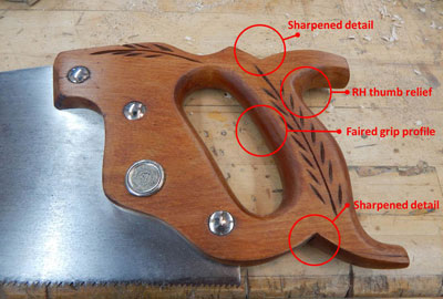 I gave some hard thought to the handle. There is a lot of value in preserving "patina" and things like paint spots that bear witness to a lifetime of hard work. That would argue for simply cleaning and maybe adding a coat of wax or BLO. However I want this saw to go back in my user rotation and at this point in my journey I have come to appreciate the refinement of hand-shaped handles. In the 1960's the mass-produced saw handle had some of the elements of the classics—the wheat pattern for example—but the overall shape was clearly pattern cut in one pass. The outline lacked any sharp corner details like the notch at the heel. The horns on the mass-produced handles also tend to be bulky to minimize the chance of damage in machine production. The actual grip had some form of rounding but also had a very noticeable angle between the side and the round. When you grip a great saw it fits your hand and you don't feel bumps and angles. I gave in and got out the rasps and sandpaper to refine the handle for a better grip.