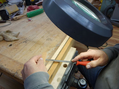 Finally, the real business end of a saw, sharpening the teeth. I set up a simple clamp in the vise using two scrap boards. The one special purpose tool that I found helpful is a lighted magnifier. 10 tpi means the sharpened faces of each tooth are pretty small and the magnifier helps see the points and edges better. The Disston didn't need jointing or retoothing or setting. After 20 minutes of simple filing the saw has a new edge. No more difficult than sharpening a chainsaw.