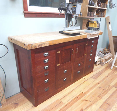 It is February and I am working on a base cabinet for my woodshop. For two years the matching benchtop has been sitting on a folding table waiting for the cabinet. Seems like other projects keep coming along and taking a higher priority. In fact, as I look around my shop I also see: a Pennsylvania spice cabinet in progress, several jewelry boxes in pieces, some dimensioned lumber waiting to become a joiner's bench, some old tools sitting in pieces waiting to be restored, and a shop bathroom that doesn't yet have a door.