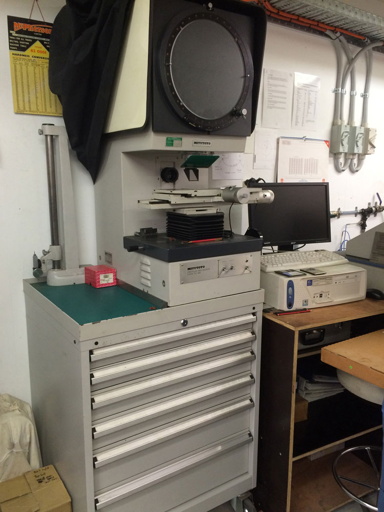 The Mitutoyo optical projector is for calibrating and measuring all sorts of things. The little mastercut branded bookmark in the second picture is a nice thing to show people how it will measure a tiny hole diameter or similar on a screen.
