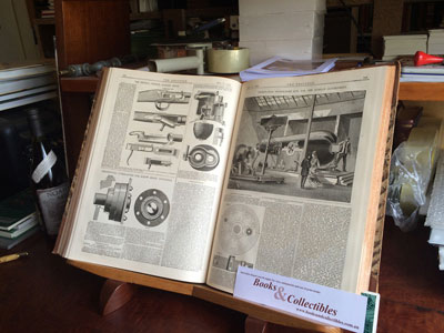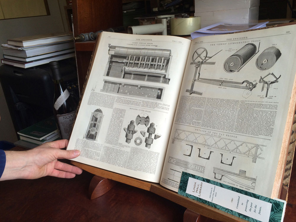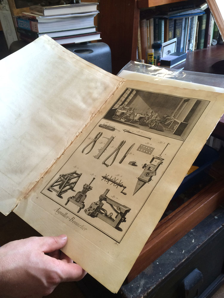 The large book on the bookstand is The Engineer, a bound UK publication from the early 1870s. The other plate set of plates is Diderot, making needles and sewing pins.