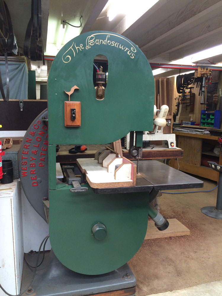 We made a stop at the Bandosawrus, Chris's world famous bandsaw that he bought when he was only 18 years old. It is quite large, quite old (built in the late 1870s), painted green, and a dedicated machine in this shop. Chris says it is the only bandsaw he owns, and he uses it regularly.