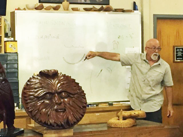. Afterwards an informal session in the afternoon provided an opportunity for class members and staff to pick his brain on matters of technique with respect to their own projects and to learn more about his carving process. Participating woodcarvers brought in an oakleaf picture frame, a dragon's head, a stylized gargoyle and a commemorative Navy plaque, among other items. One attendee had carved his first piece following Pye's