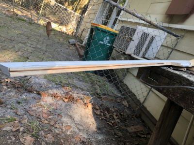 Arriving, I had the old siding off in no time, and the first two, unmodified pieces tacked in place, fitting perfectly. I marked up the last piece and made my cuts.