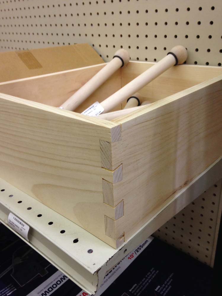 Confident that I knew what I was doing at last, I began the A box full of gusto freehand--and promptly cut my joints backward. An inverted dovetail is useless, and although there are reports of one still standing in a timber frame house in Vermont somewhere, I do not recommend chancing it. I chopped off the ends with the Kapex and recut the joints to make a smaller box. This one held together without glue, possibly because I was now overcompensating and leaving too much waste in the joints. Three serviceable, if unattractive boxes resulted from my efforts thus far.