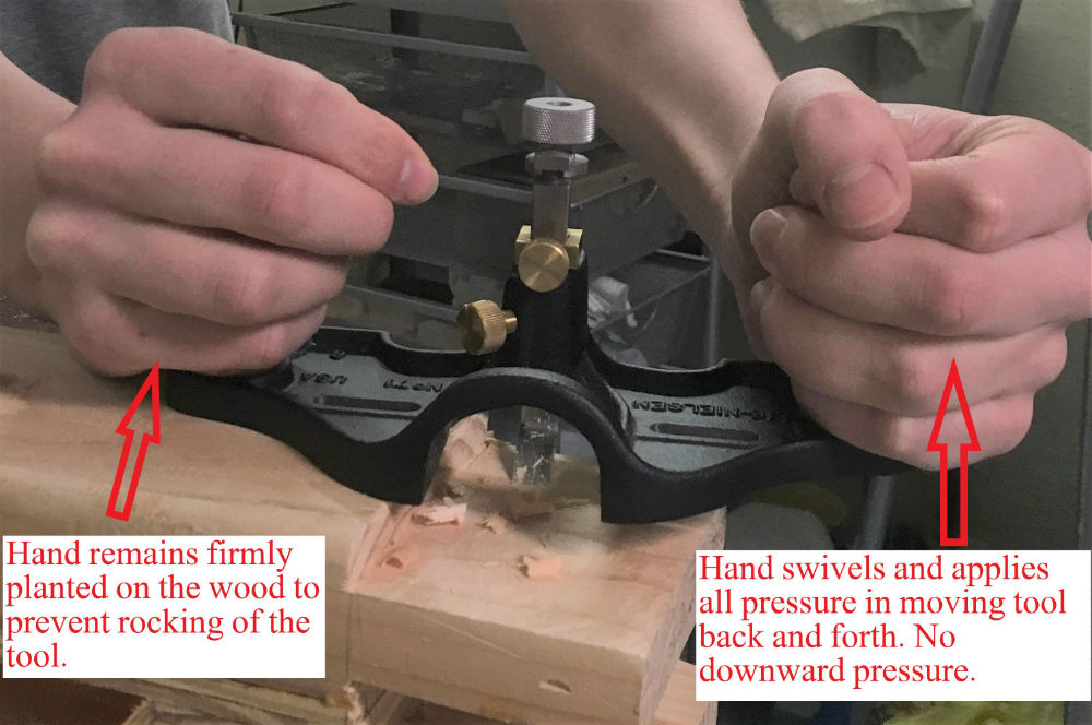 This decreases the resistance against the blade making an easier cut. It is really important to maintain very strong downward pressure with the planted hand to ensure that the plane doesn't inadvertently tip and take a heavier cut on one side of the blade, causing an out of square tenon.