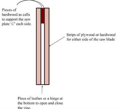 , that joins two pieces of plywood with hinges at the bottom and has two calls screwed on at the top. This is the saw vise used at Lie-Nielsen Toolworks to hand sharpen saws before being shipped. I have drawn a similar design, the one that I use, based on the Lie-Nielsen design below: