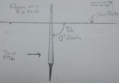 Fleam is the angle that the file is presented to the saw looking down on the plate from above. The orientation of the fleam angle is drawn below:
