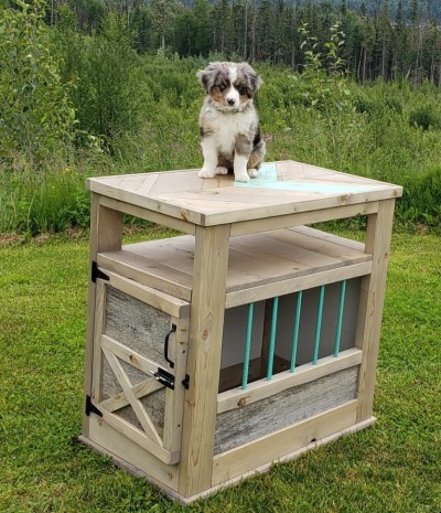 Currently, Sarah is working on a dog kennel. Her kennels involve interior shiplap designs and metal rails,