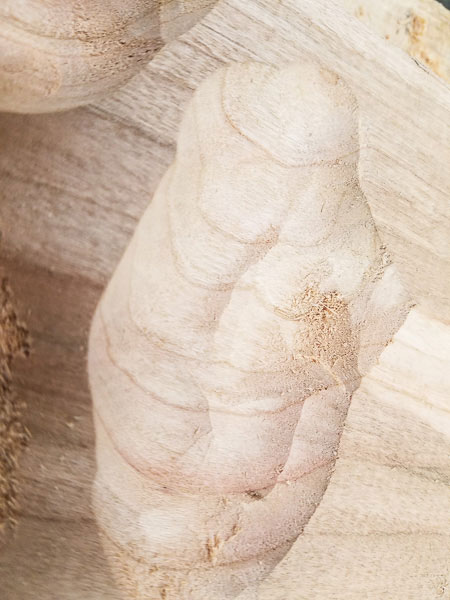 remounting the blank in the vise to be able to chop with or across the grain. Using the ball gouge, I