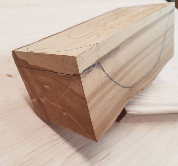 ball gouge. I started out with a block of cedar and drew a rough outline for an oval bowl with an
