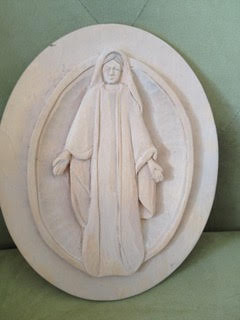 On New Year's Eve before 1998 began, my sister, a police officer was seriously wounded. I was snowed in in Columbus and couldn't get to her for several days and I started working on this relief carving of the Virgin Mary for her while saying rosaries all the time while I was doing it. It was in the old days so when I was finally able to fly out I was still carving it on the plane all the way across the country. It diverted my brain from the constant worry. I finished it as I arrived. I had never done a relief carving before.