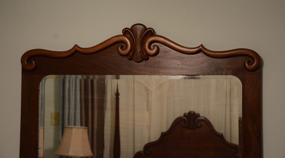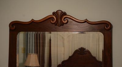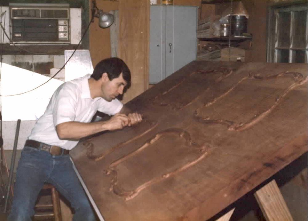 My largest project was carving a door for a French chateau being built on the bank of the Mermentau River in Louisiana. Presented with a 48" by 96" slab of 3" thick mahogany, I was required to remove a 1/2" layer from each face of the door (32 bf of material) leaving only eight raised rectangular outlines on which to carve a floral motif. Completed in 350 hours, this was to be my only real commercial piece. I did not bid or advertise for the job. It was offered to me because there were so few people doing this kind of work and I accepted because I didn't know any better. I did learn to repeat each detail on each of the four segments per side before starting the next detail. This kept them more consistent and the work more balanced as a whole. The designs were drawn by me from photos that I took of an antique dresser that my client owned. Pleasing a very exacting and demanding client was a challenge. At one point, after having removed only 7/16" and not the requested 1/2" (to better suit my design interpretation and leave more material for the door) he had me remove the the remaining 1/16" from the entire side. I was able to talk him out of having me do the work on site and 45 minutes from my home.
