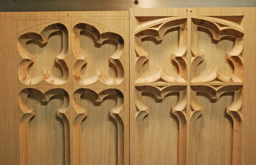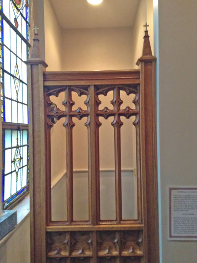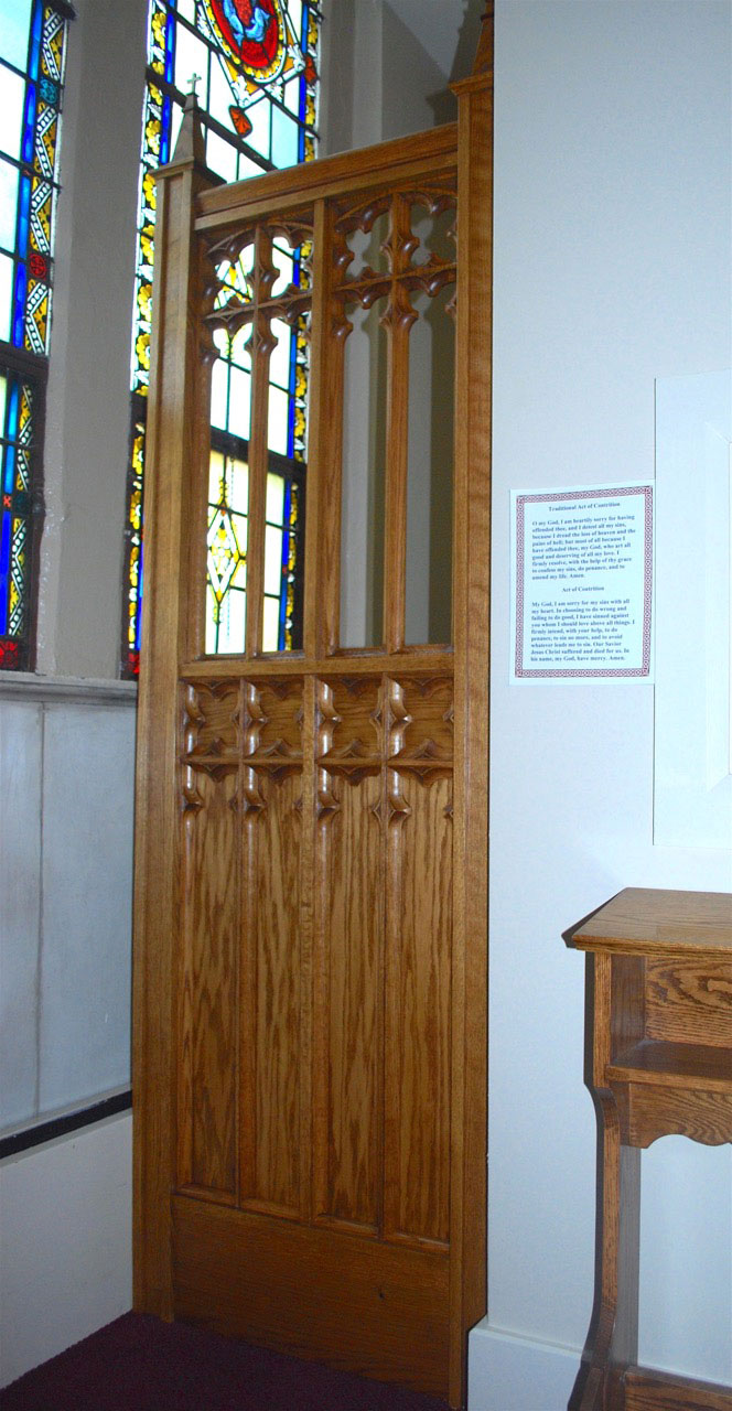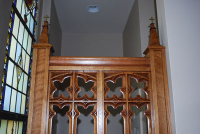 I have been honored by being asked to make several pieces of work for the beautiful St. Joseph's Catholic Church here in Macon. When asked to build a sheetrock partition to close off this area it occurred to me that there should be a better way that would not block the beautiful windows. My first thought was wrought iron grill work; but since woodworking is my forte, this became a chance to try the style of work that I have admired for so many years and never had a reason to attempt. The carving amounted only to finishing the router produced coves into the pointed corners in the upper half and making the triangular incises in the upper and lower halves of the divider. In the lower half each element is mitered and set into either a square or rectangular frame. This piece gave me much satisfaction.