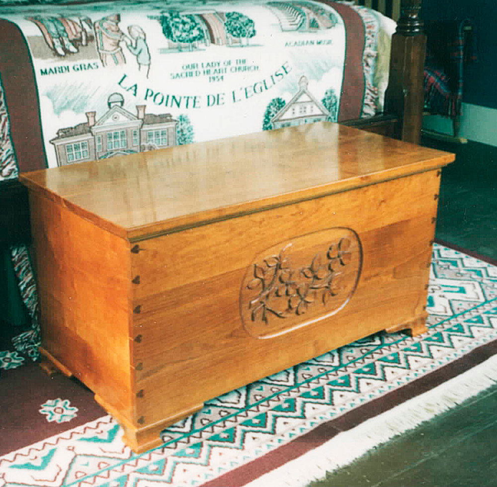 My interest in woodworking has always been mainly focused on furniture or home accent projects. Some of the more ambitious projects required details that could only be done with hand work of a gouge or chisel. Most work is low relief, such as a flower and leaf detail added to a chair crest rail. My first carvings were small flowers scratched into wood with a very cheap set of carving gouges that came as a set of twelve in a plastic sleeve. Price - about $4.00. Better tools followed, two or three at a time, as various projects required. One project called for ball and claw feet for a drop leaf secretary, another required a dogwood flower and branch for a weaving loom and a hope chest. The hope chest for my daughter was selected to be included in Lon Schleining's book,