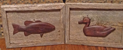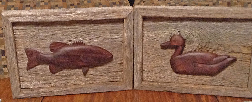 These framed wildlife carvings were for a “man cave" playhouse built by the Middle Georgia Woodworkers and Middle Georgia Woodturners of Macon. The playhouse is an annual project with the proceeds donated to Rebuilding Macon Inc., an organization that refurbishes homes in the area. Black Walnut on weathered oak.
