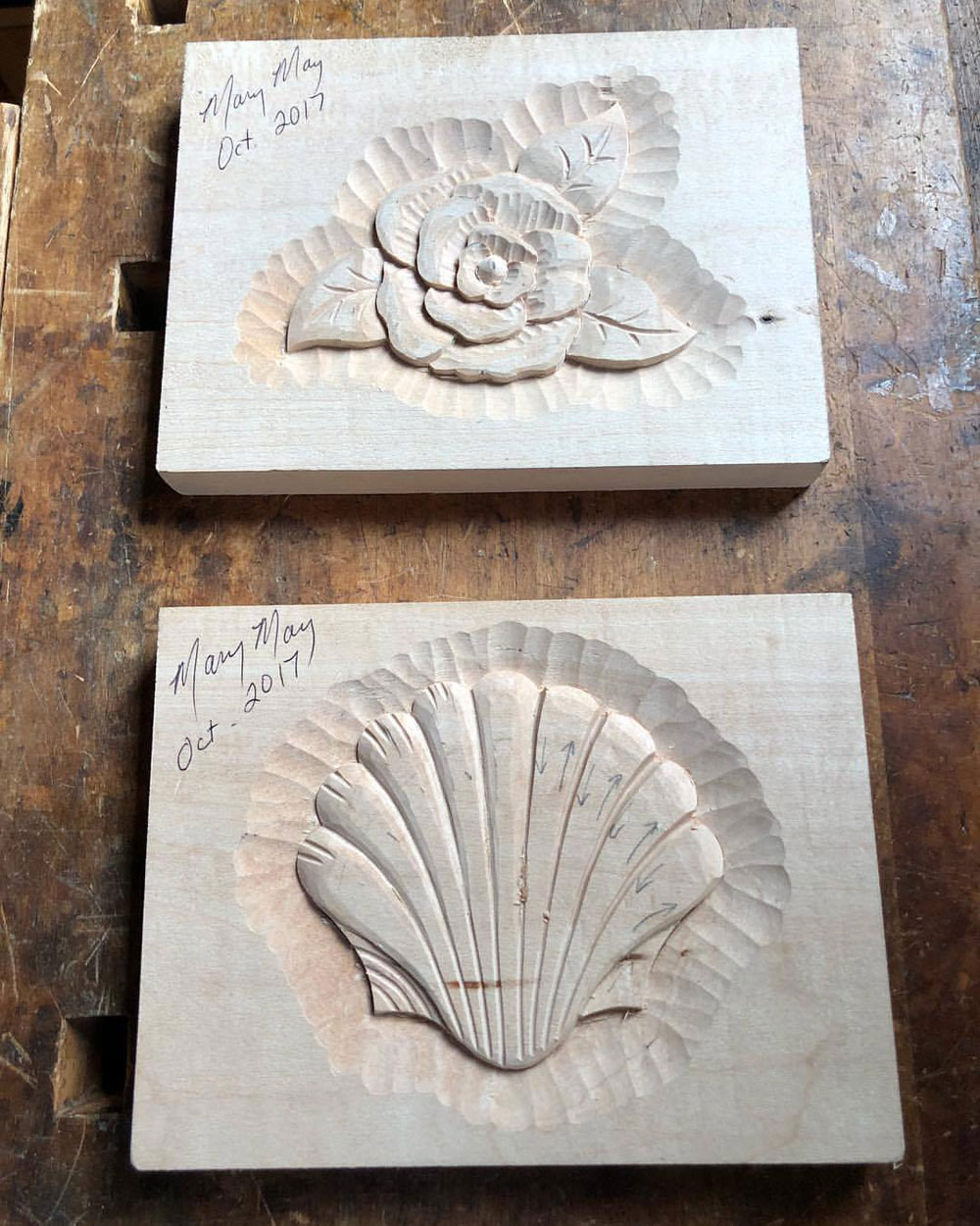 Last month, we here at Highland Woodworking had the privilege of hosting an introduction to woodcarving class by professional woodcarver, Mary May. Eight lucky woodworkers had the opportunity to carve a floral design and a classic scallop shell in this two-day intensive here at the Tage Frid classroom. Although I was unable to attend the class in person, Mary was kind enough to answer some questions about her profession and interests.