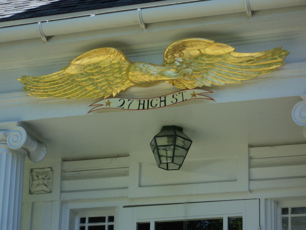 It features a spread wing eagle. The head and neck are carved from a separate piece of wood and applied to a base between the wings. The neck sweeps upward and the carved head has all of Bellamy's stylistic features. Applied to the eagle and running diagonally in front of the right wing is a carved flagpole. Below the finial of the pole is an attached carved and painted banner that has a reverse curve with a swallowtail end over the wings. I prefer to duplicate the original gilt surface. The front of the banner has a carved & gold-leafed five pointed star set into a blue background. Below the neck and running along the bottom side of the left wing is a carved and painted American shield with small carved five & gilded stars. The shield features red, white and blue paint decoration. The eye, tongue and interior of the eagle's mouth utilize the original red polychrome. The banner is painted with blue lettering and is embellished with red shadowing. The borders of the banner feature a red pinstripe.