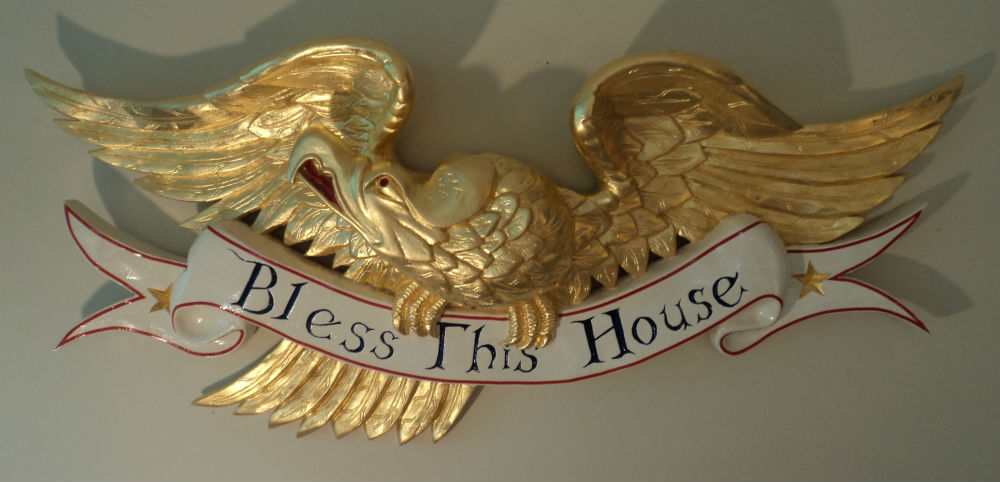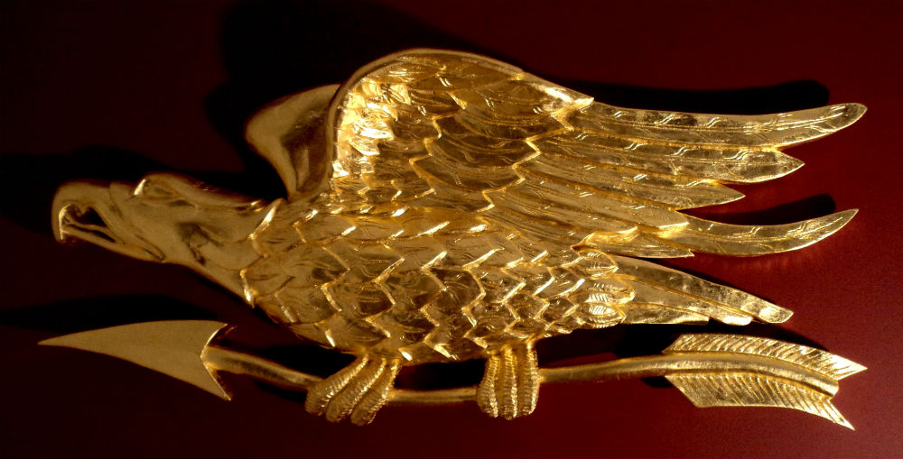 I offer my eagles in the traditional finishes: either painted white with gold leaf accents and carefully painted banners, or unfinished, or gilded with genuine 24k Gold-leaf. I perform every step myself, including board selection, roughing out with Windsor chair tools, carving, painting, gold-leafing, and the intricate detailed painting of shields, banners, and flags. While remaining true to the spirit of Bellamy's symbolic, aesthetically pleasing folk motif, I have developed some of my own stylistic features, such as a greater depth of carving, curved necks to give a greater sense of flow, up-curved wing tips which add to the feeling of movement, etc. I also enjoy developing my own eagles, which are historically-based but completely new designs.