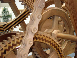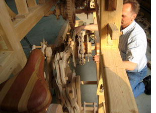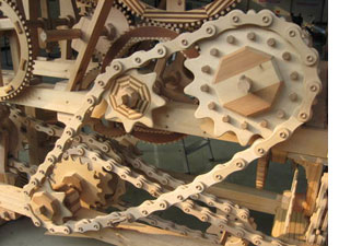 For the last several years, Erich has devoted about six hours each Saturday to building his machine. It had its genesis in 1998 when his interest in sprocket wheels and chains led him to successfully build a bicycle chain entirely out of wood, a process which required numerous complex calculations to get all the parts to fit together and function correctly. This led to the idea of building a wooden machine which eventually grew to occupy more than 400 cubic feet of space.