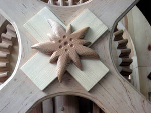Erich never lacks for ideas. He is already underway building a second machine, which though not as large as the first, will be considerably more intricate, featuring a planetary gear system nearly three feet in diameter. It is driven similar to the first machine using a wooden chain. The operator sits on a wooden saddle which slides backwards and forwards along "a swallowtail butterfly guide rail." He expects to work on building the machine for another three years before it is ready to exhibit.