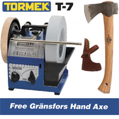 While supplies last, order one of our Tormek T-7 wet grinders, and upon registering your grinder with Tormek, receive free a Gransfors Bruks premium hand axe, a $110 value.