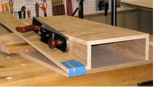 masking tape, and a couple of clamps, it was easy to mock up the shooting board. Sliding the plane down the