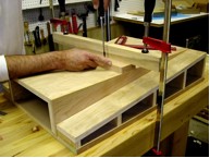 After the work support was affixed, I used my jack plane to trim the cherry chute sides flush so that the
