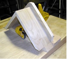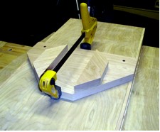 Figure 22. 45-degree fence clamped in place and ready to cut perfect miters on either side of the shooting board.