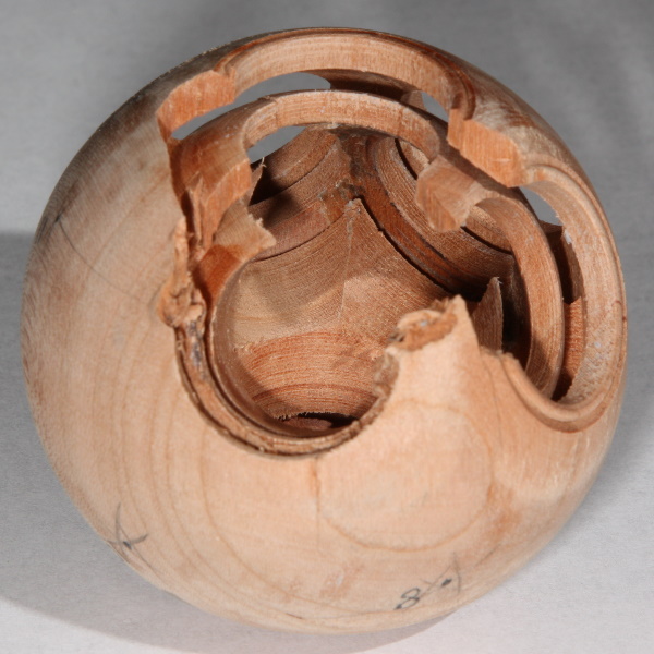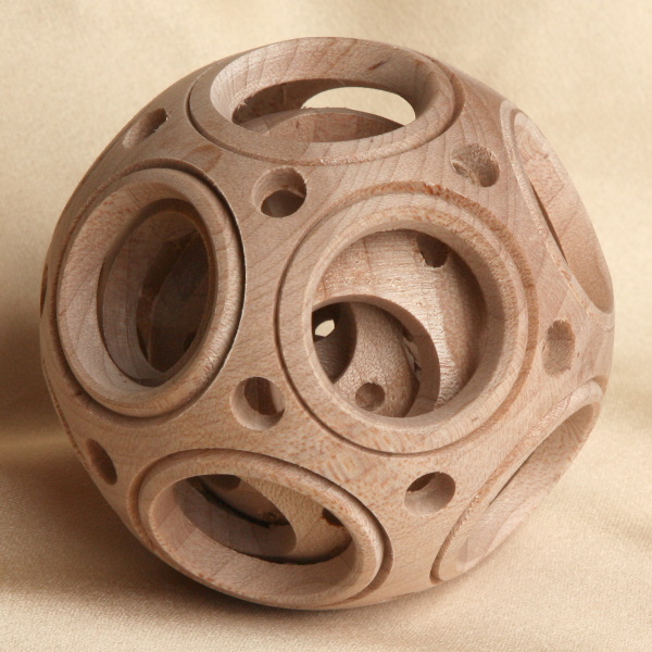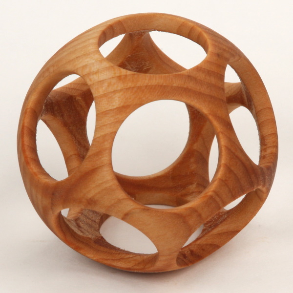 a wooden sphere about 2-1/2″ in diameter with 12 holes about 3/4″. The sphere is