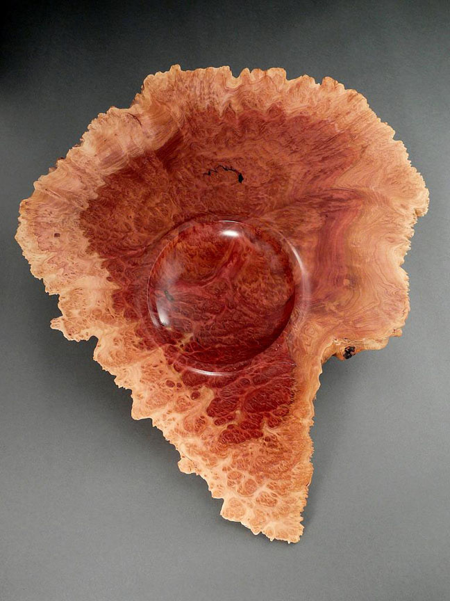 Red Mallee Burl Bowl, 15 x 12 inches. Natural edge rim, birdseyes.