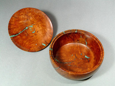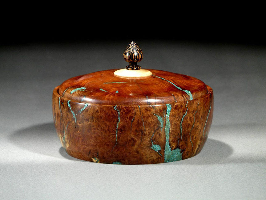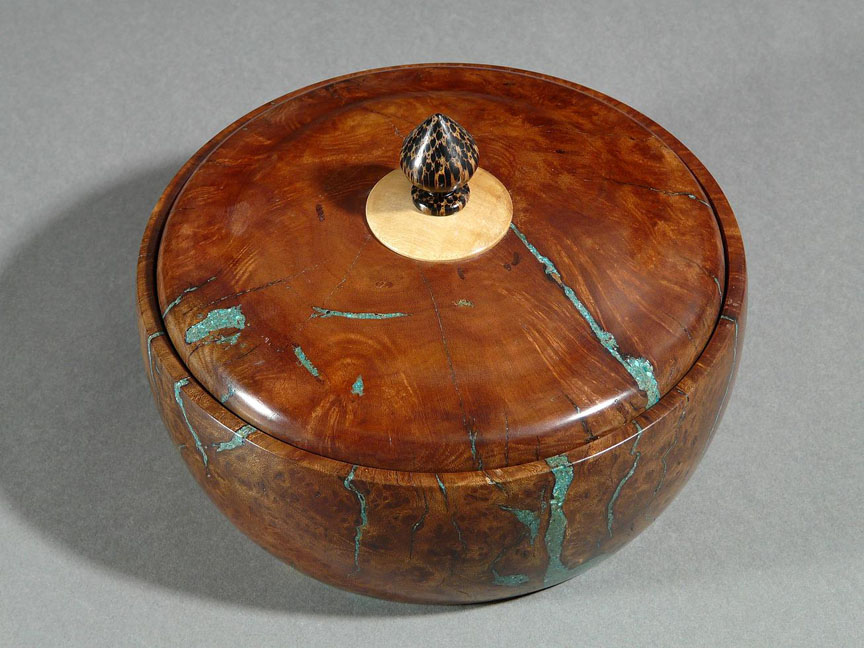 Manzanita Burl Lidded Box, turquoise inlay, Maple, Black Palm pull. 6-1/4 x 4-1/4 inches.
