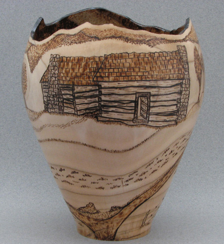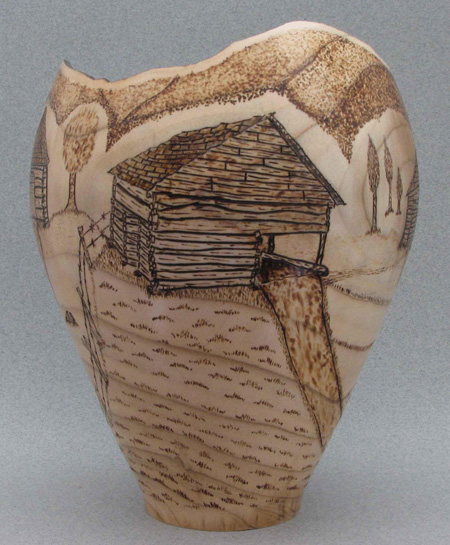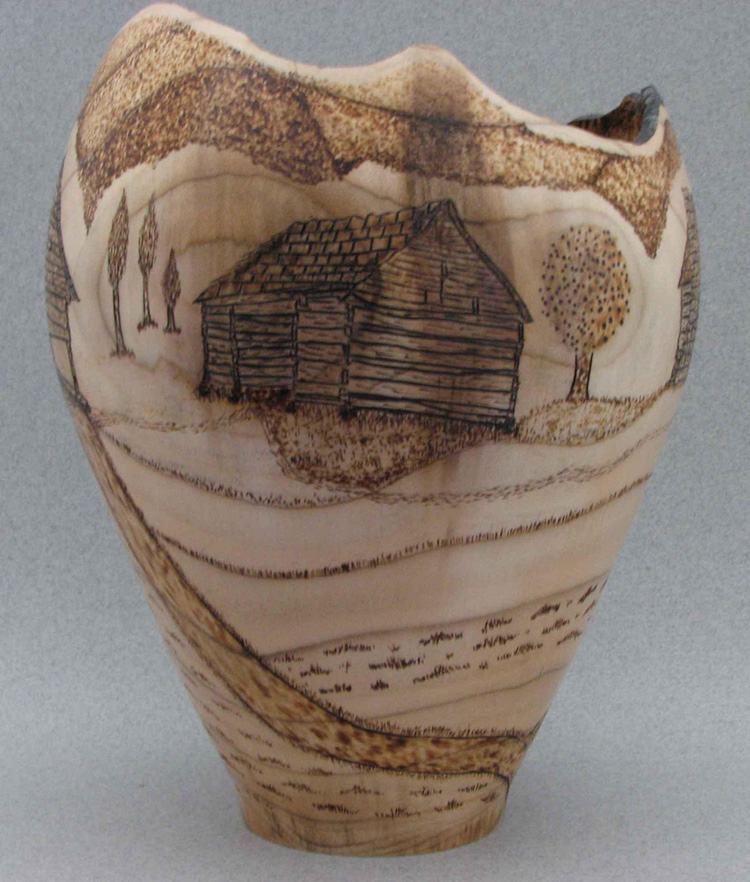 "Mountain Farmstead" was created from Southern Magnolia and by woodburning. The vessel is eight