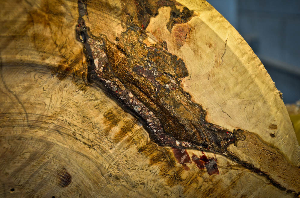 As we removed material, a few areas presented serious structural integrity concerns. We were already working very hard to manage this piece through the process, without sacrificing the overall size. The size and grain was the whole story with this piece. The blank had an area with a large bark inclusion. Fortunately, it looked, and felt, tight and sound. However, there were several areas on the rim that contained a series of cracks. So we opted to stop for the day, to allow Pete to add more Mirror Coat Epoxy to the areas of concern.
