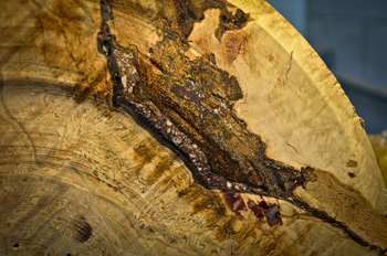I examined the edges of the tools, and was surprised to see mangled edges on both the bowl gouge and scraper. We speculated that perhaps dirt or rocks were lodged in the bark inclusion. Interestingly, we noticed that the wood was still slightly damp. The wood should have cut much more easily than what we were experiencing. I even stepped in to give it a try myself. I experienced the same results. Definitely not an error in our technique.