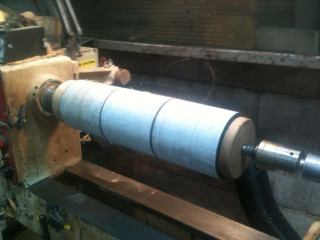 Finally I put my new sanding drum on the lathe. I rotated the drum at a slow speed and trimmed both ends to square it up with a sharp skew or knife (it really doesn’t matter about the ends, it just looks good). Sand on, McDuff!