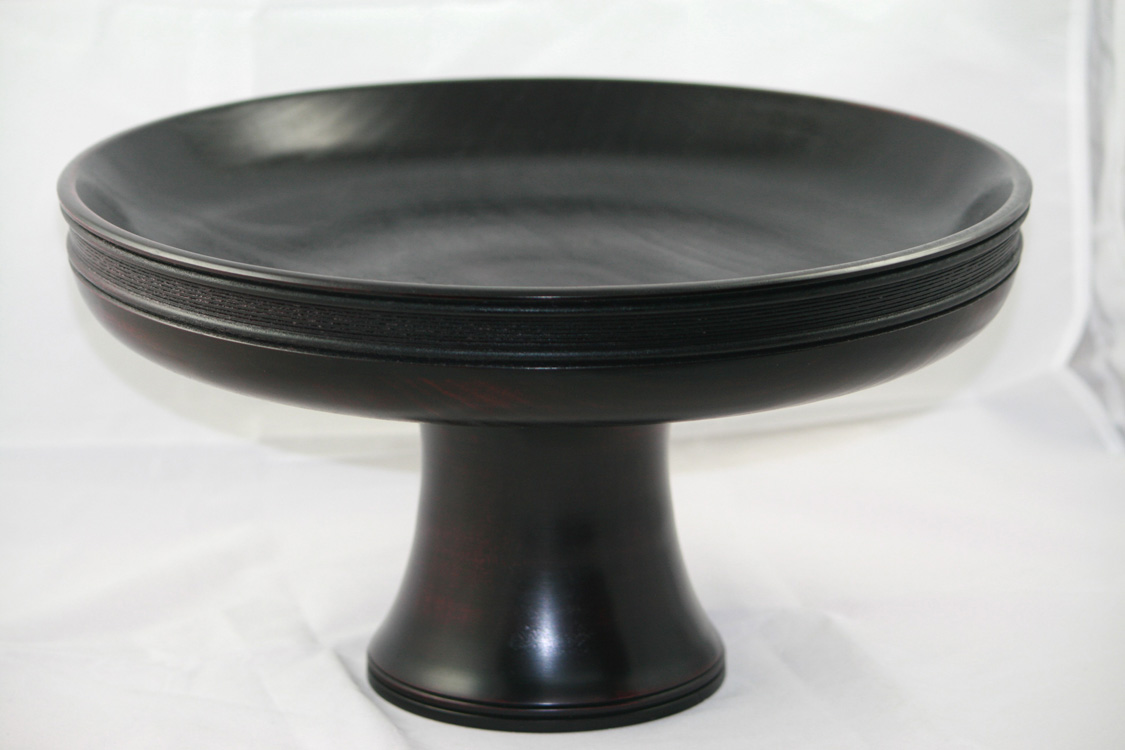 Pedestal bowl made from poplar for the bowl and pear for the base. Dyed red undertone then black. Lightly sanded the black to have red highlights show through. Size is 13" round and 8" high. Made as a wedding gift for my cousin in Tennessee.