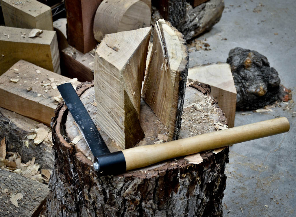 Once the split has started, you can switch to the froe (for smaller logs) to continue the split down the log. The froe is used by moving the handle back and forth forcing the split further down the log. As the split moves down the log the froe is pushed deeper into the split.