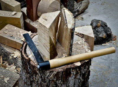 A small axe or hatchet is used to refine the shape after using the froe. I use two types of small axes for the hewing process: a traditional broad axe that I re-handled, and a