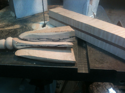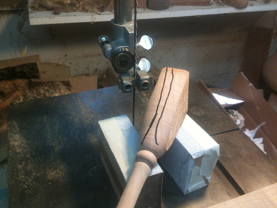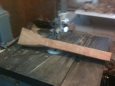 Next, I draw the basic spatula design on the wood, then I rough cut the shape on the bandsaw.