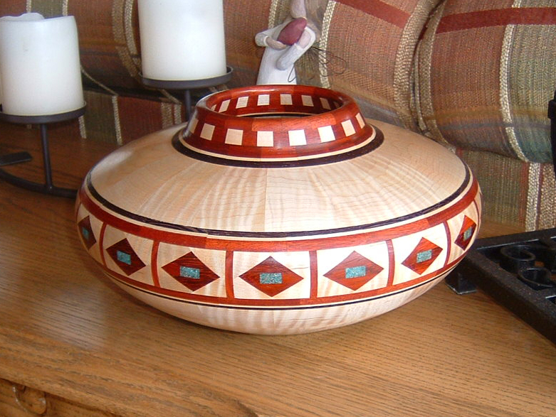 The piece was just completed and contains 487 pieces and took me 107 hours to construct. It is very nearly 12" in diameter and consists of curly and soft maple, bloodwood, wenge, and ebony. The turquoise in the feature ring was fashioned from a two part resin. I finished the bowl with