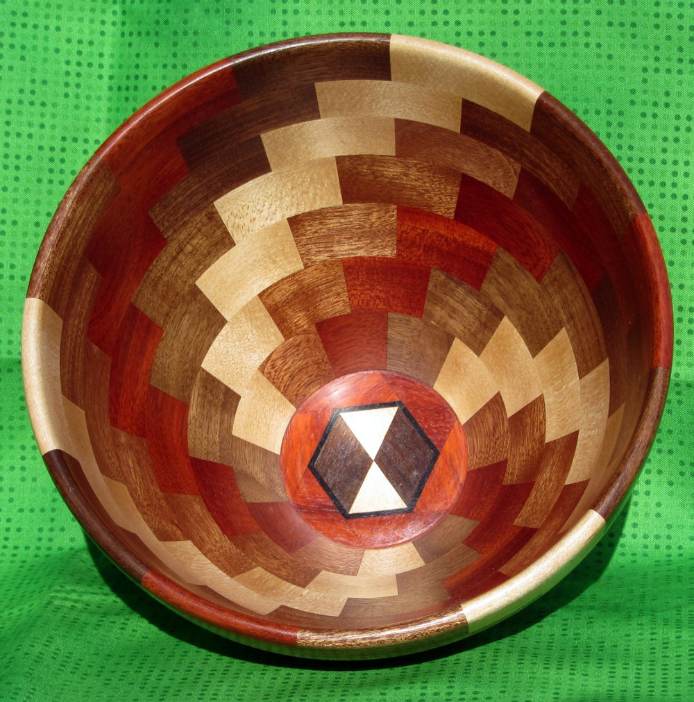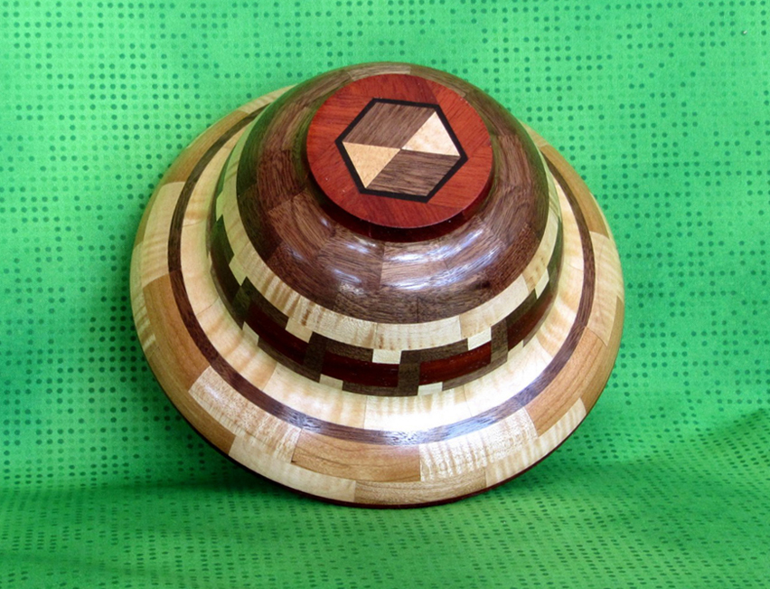 ". However I can call it an original because it is an 18 segment bowl (his is a 16), the bottom is constructed of a maple plug embedded in Ebony rather than a solid wood piece, I assembled and finished the hemispheres independently rather than hollowing the bowl from the top entrance, and I used several wood species that differed from the Allen plan. In addition, I constructed it in a totally different way than the book directed.