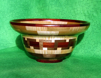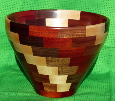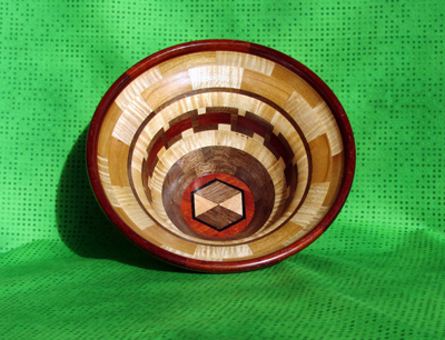 Mylands High Build polish. When finishing it, I had a considerable problem in preventing the oily bloodwood from bleeding into the very light curly maple and solved it by finishing both wood species independently with cotton swabs. This effectively sealed the wood which enabled me to apply the final layers by mounting it on a revolving lathe. I have been constructing segmented bowls for 3 years and this is my fifth bowl.