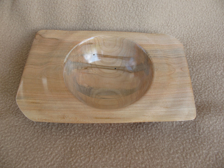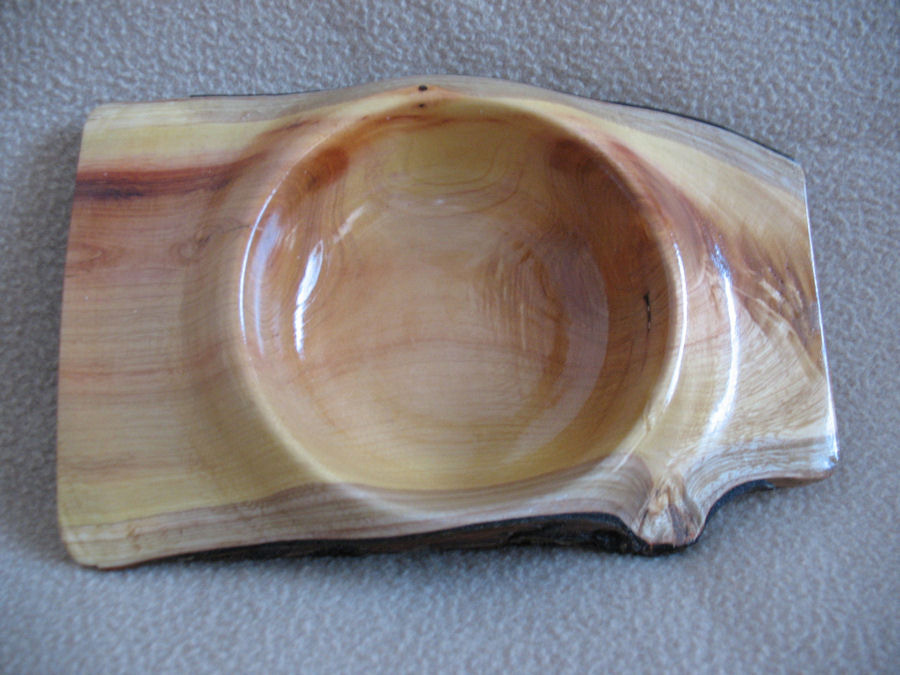 This piece is Common Buckthorn, which came from a local area. It is an intrusive large bush or a small tree, has berries that the birds eat, but nothing grows under its branches. The largest diameter of any trunk is 4 to 6 inches. This piece came from a crotch and most of the wood has the orange center with a small yellow trim, followed by the tan sap wood.