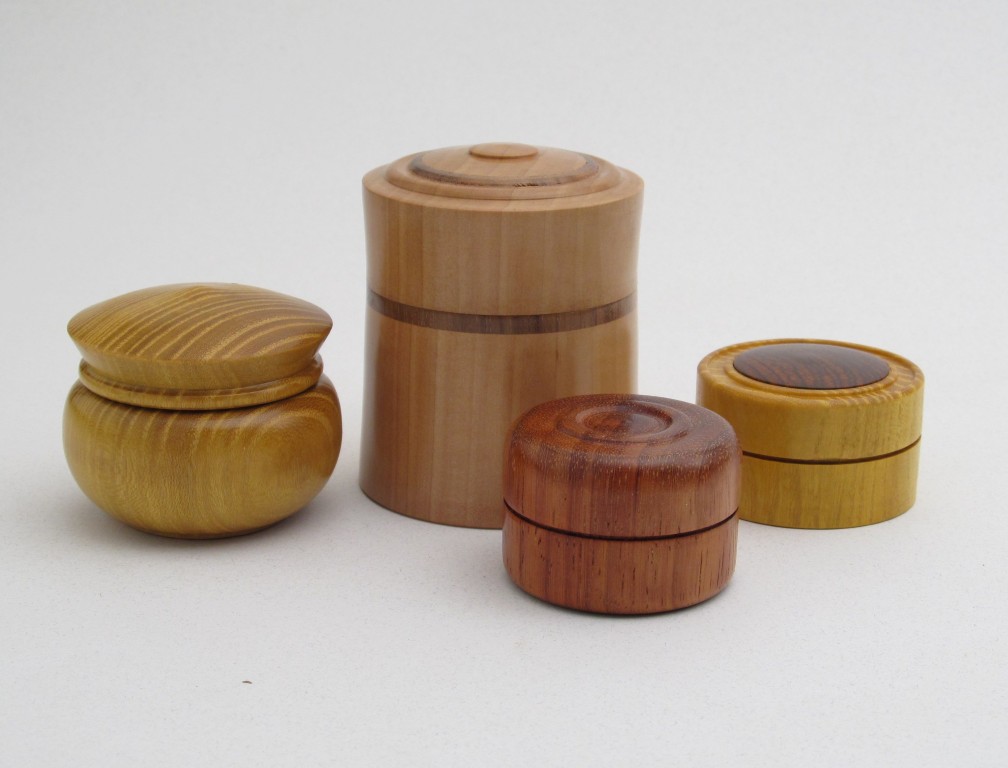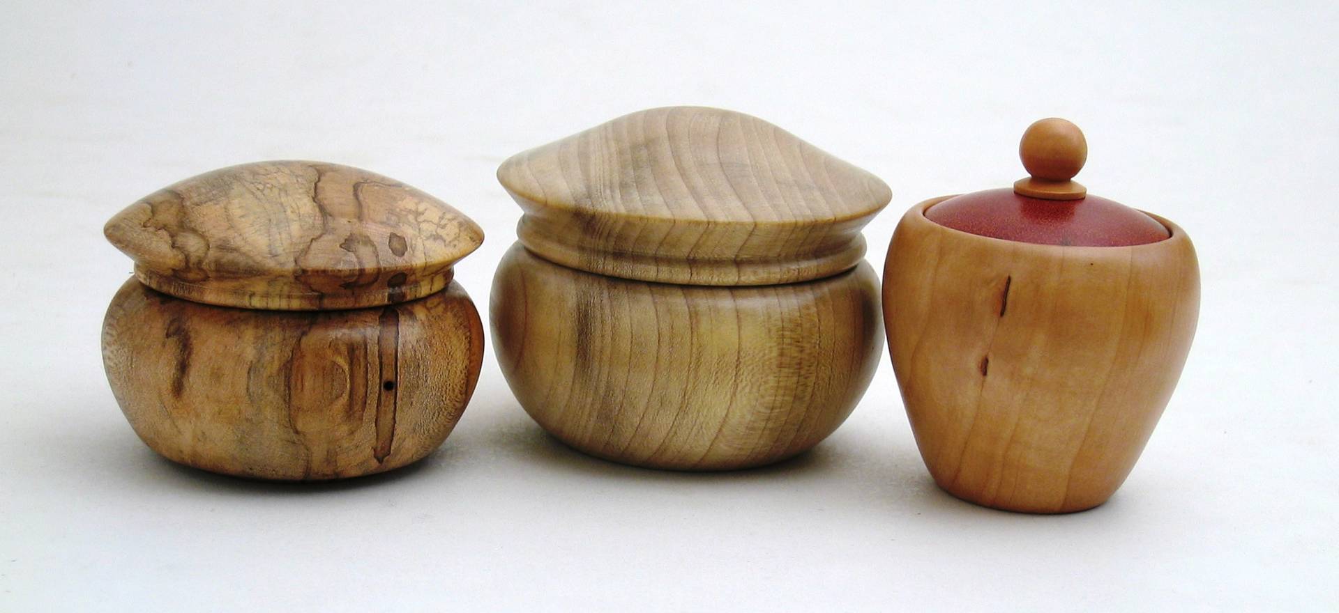 Three recent boxes. One on the left is Ambrosia Maple, middle one is Maple, and the one on the right is Bradford Pear with a Redheart lid.